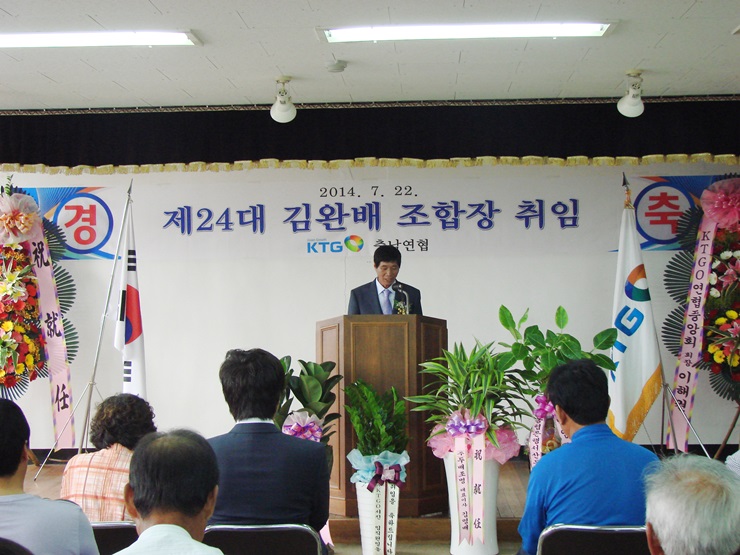 KTGO 충남연협은 2014년 7월 22일 당선된 김완배(金完培 58세) 조합장의 취임식을 거행하였습니다. 이날 취임식을 축하해주기 위해 KTGO 연협중앙회 이해권 중앙회장, 서기철 상무이사, (주)KTGO연협 농업회사업인 조규용 사장외 많은 내외빈과 조합원이 참석하였습니다. 김완배 조합장은 이번에 KTGO 충남연협 조합자으로 7월 22일 취임하여 2018년 7월 21일까지 임기를 수행하면서 조합발전을 위한 책무를 지게 되었습니다.