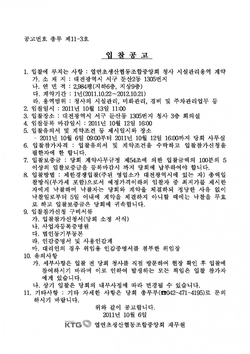 입찰공고[엽연초생산협동조합중앙회 청사 시설관리용역 계약]