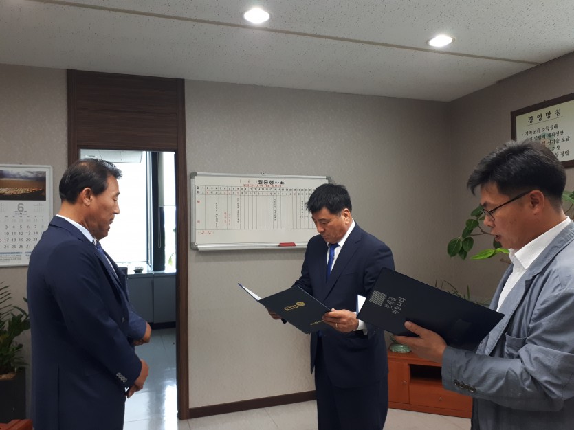 임용장 수여 작성일2019-06-28 본문 2019. 6. 27. 중앙회 회장실에서 조합 전무이사 및 출자회사 임용장 수여식이 있었다. 이번 인사발령에서 신명진 출자회사 사장은 중앙조합 전무이사로, 중앙조합 이반구 전무이사는 출자회사 사장으로 임용되었으며, 북부조합 박재철 전무이사는 재임되었다. 이전글 다음글 목록