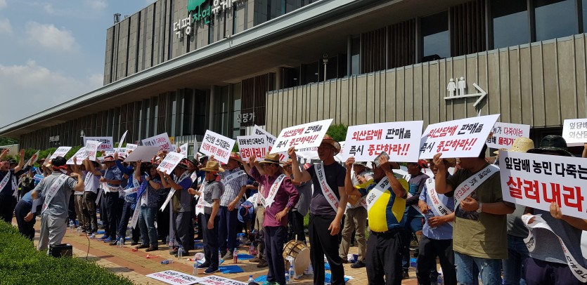 덕평휴게서 양담배 판매 규탄대회 작성일2018-08-31 본문 금일(8월 31일) 영동고속도로 덕평휴게소에서 양담배 판매 결정을 철회할것을 요구하기 위하여전국 15개 회원조합의 조합원과 중앙회 임직원이 참여한 가운데 양담배 판매 규탄대회를 개최하였다. 덕평휴게소 경영진과 마주한 자리에서 전국 잎담배 생산농가를 대표하여 중앙회 회장단은 잎담배 농가와 한국농촌을 보호하기 위하여 양담배 판매 결정을 철회 해줄 것을 요구하였으며, 덕평휴게소 경영진은 심사숙고하여 답변해 주기로 하였다. 이전글 다음글 목록