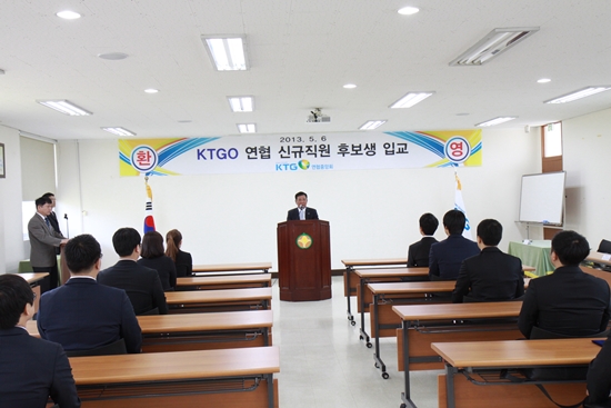 2013년도 KTGO연협 신규직원 후보생 입교 작성일2013-05-06 본문 KTGO연협중앙회는 2013년 5월 6일 11:00 교육원 대강의실에서 2013년도 KTGO연협 신규직원 후보생 최규성외 10명의 입교식을 개최하였습니다. 입교식은 KTGO연협중앙회 이해권 회장, 박종현, 김중진 부회장과 류재호 사업국장, 박녹제 총무국장이 참석하여 후보생의 입교를 축하하였습니다. 이번 46기 KTGO연협 신규직원 후보생의 교육은 7월 26일까지 12주간 진행될 예정입니다. 이전글 다음글 목록
